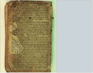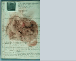 This book has suffered severe mould damage, not just to the surface of the paper shown but also to many layers beneath.