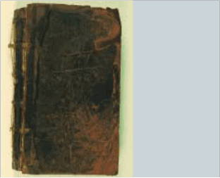 The leather covers of this 17th century book are badly worn and scuffed.